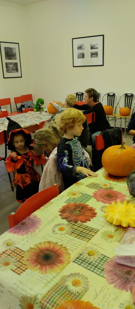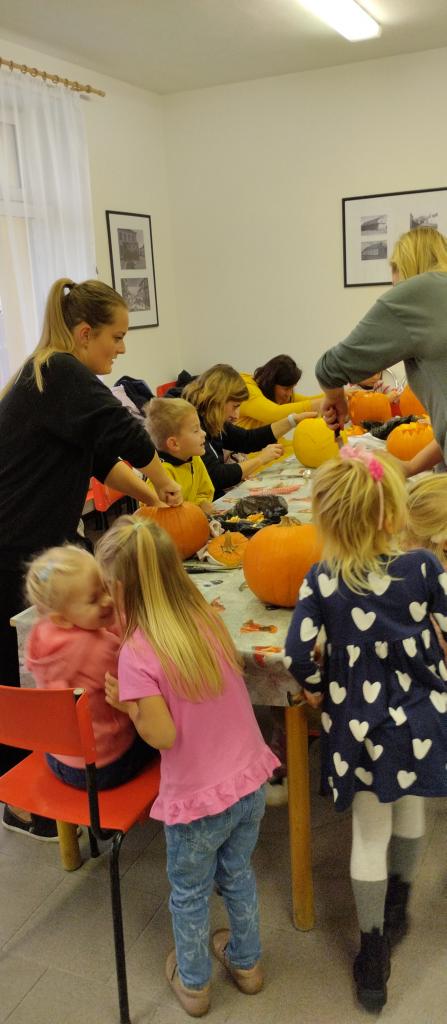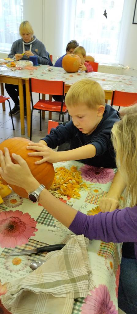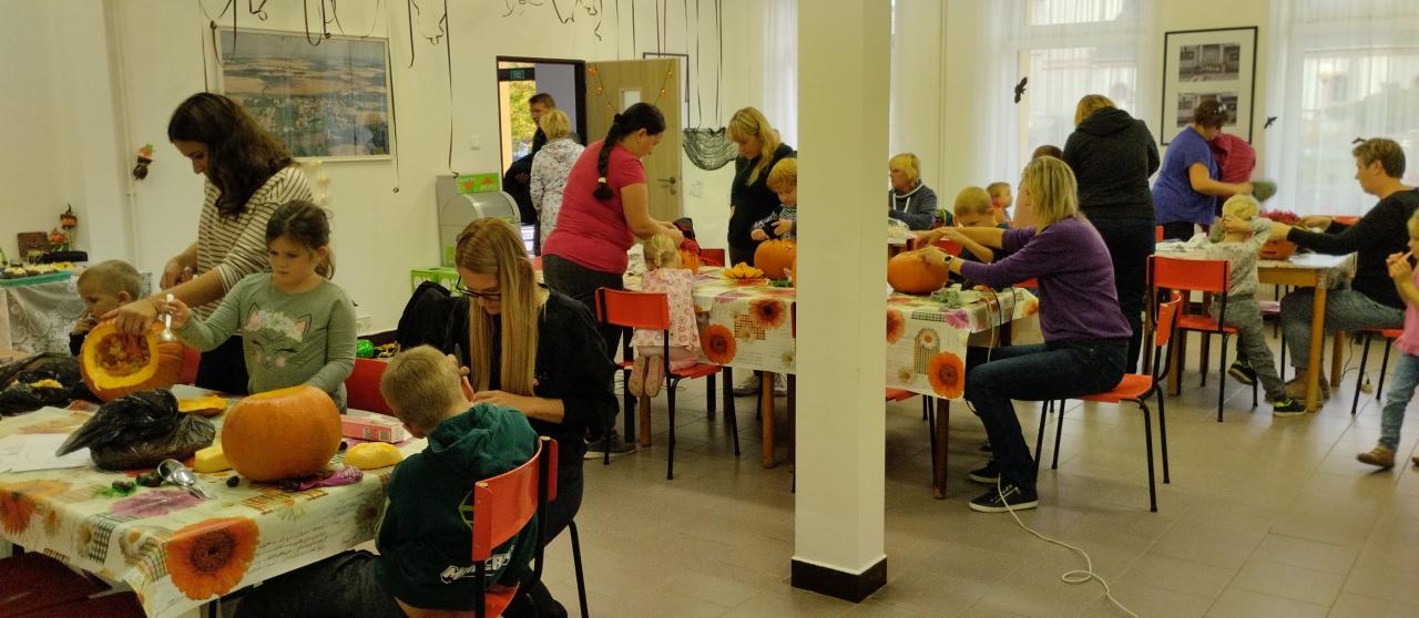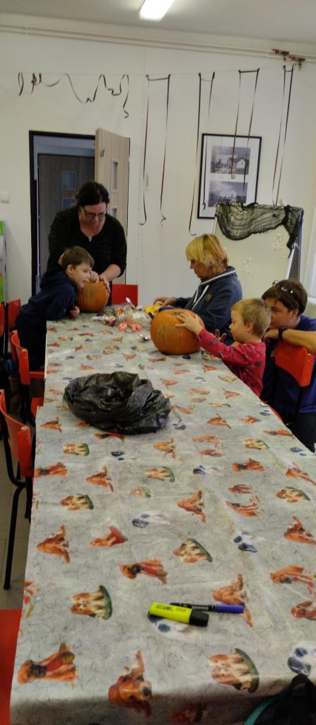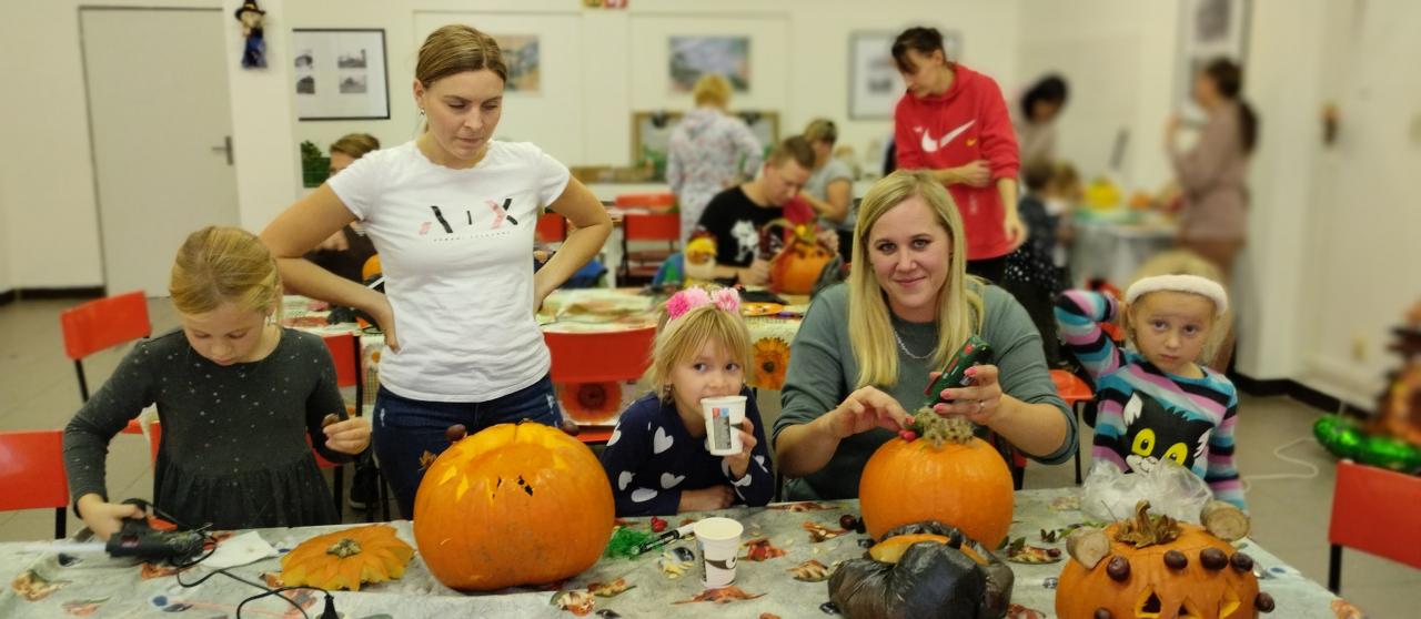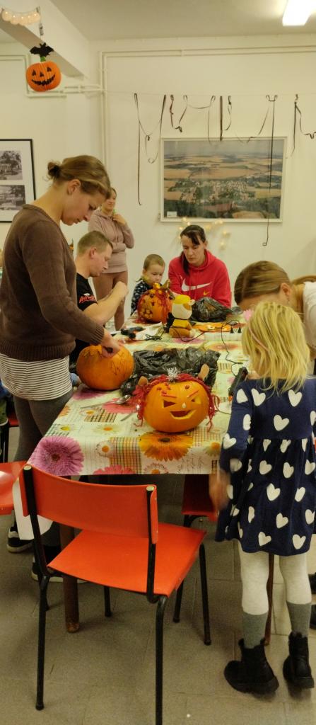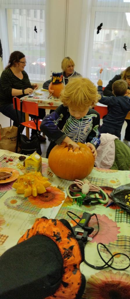 Společné tvoření rodičů a dětí s halloweenskou tématikou.